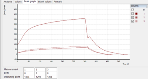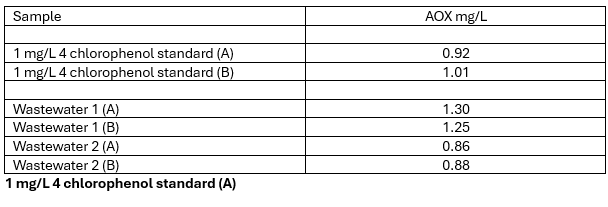 - The accuracy of measurement is determined by adsorbing and measuring a standard 4-chlorophenol solution using the APUsim and Multi X 2500 as described above. This is compared to the measurement of some real wastewater/effluent samples below.