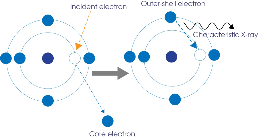 The formation of characteristic X-rays is a key principle in EDS. When an electron beam in an electron microscope strikes a sample, electrons from the beam may undergo inelastic scattering. This process knocks an inner-shell electron from an atom in the sample (typically from the K, L, or M shells). This creates a vacancy in the inner electron shell, which is then filled by an electron from a higher-energy shell.