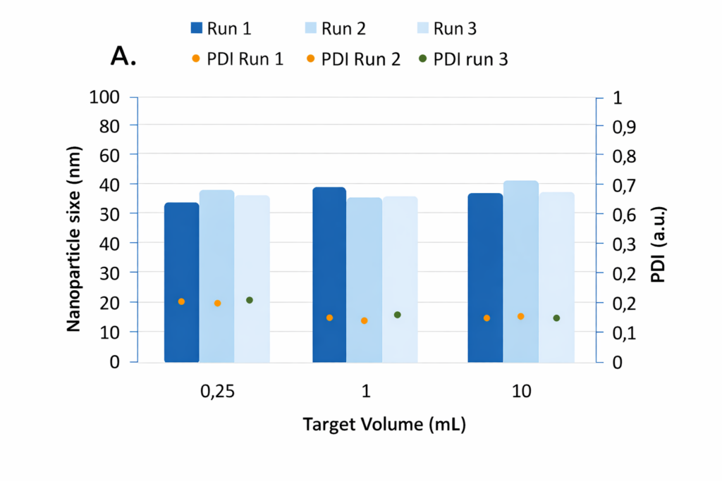 - Nanoparticle size and polydispersity index (PDI) measured across three runs at different target volumes, demonstrating consistent particle size and low PDI during liposome synthesis.