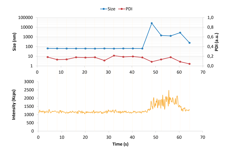 The VASCO Kin instrument includes NanoKin software that enables real‑time tracking of particle size during measurements. In the example provided, an unexpected event occurred during a one‑minute measurement.