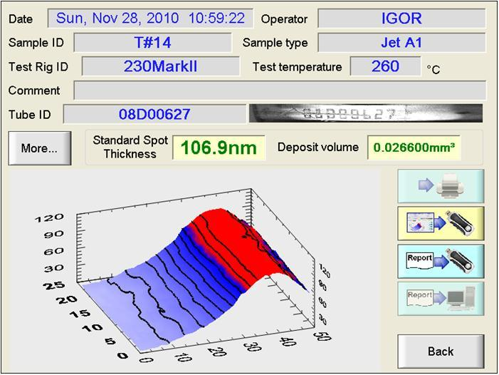 Data reporting is another area where the DR10 excels. Beyond providing standard measurements, the instrument generates detailed 3D profiles of deposit distribution on the heater tube surface. These reports include critical parameters such as the standard spot value, average and maximum deposit thicknesses, and total deposit volume. The heater tube rating data can then be compiled with the results from the TO10 jet fuel thermal oxidation test data